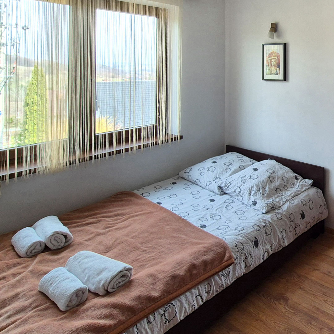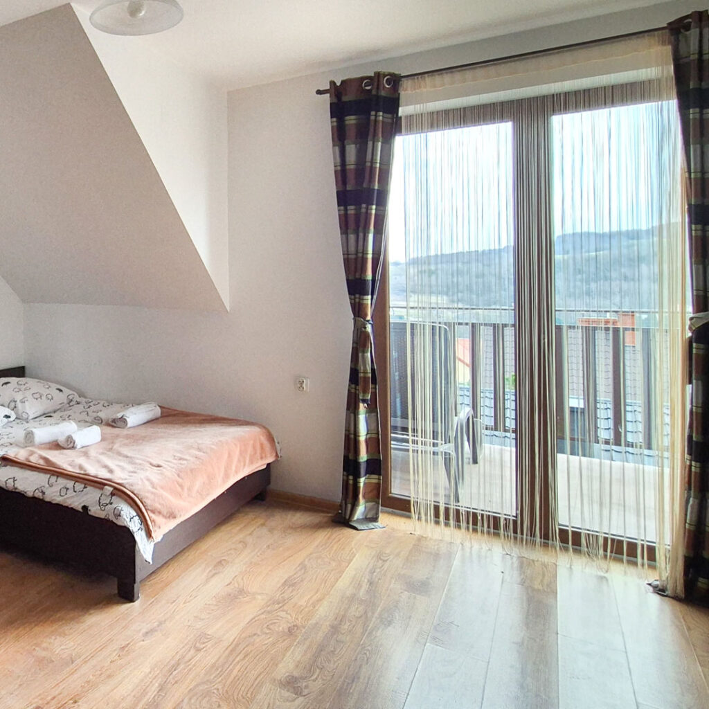 Pokój urządzony w ciepłych, drewnianych tonacjach, z dużym łóżkiem małżeńskim. Charakteryzuje go elegancka prostota i funkcjonalność. Widok z okna wychodzi na zalesione wzgórza, zapewniając idealne warunki do porannego relaksu. Łazienka utrzymana w jasnej kolorystyce.