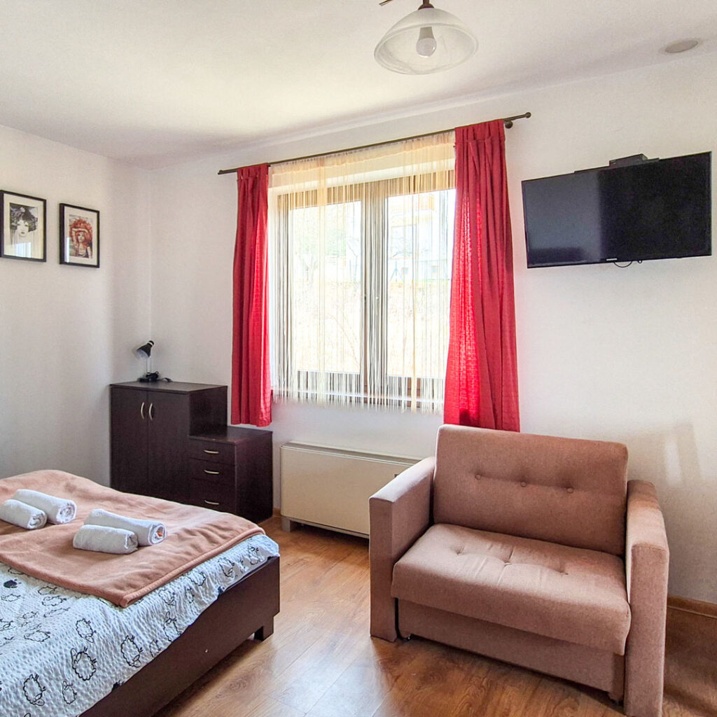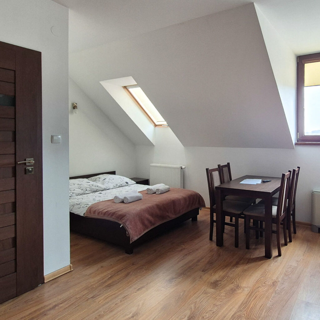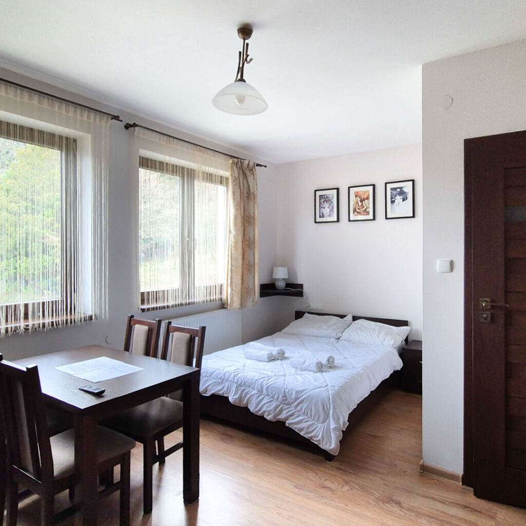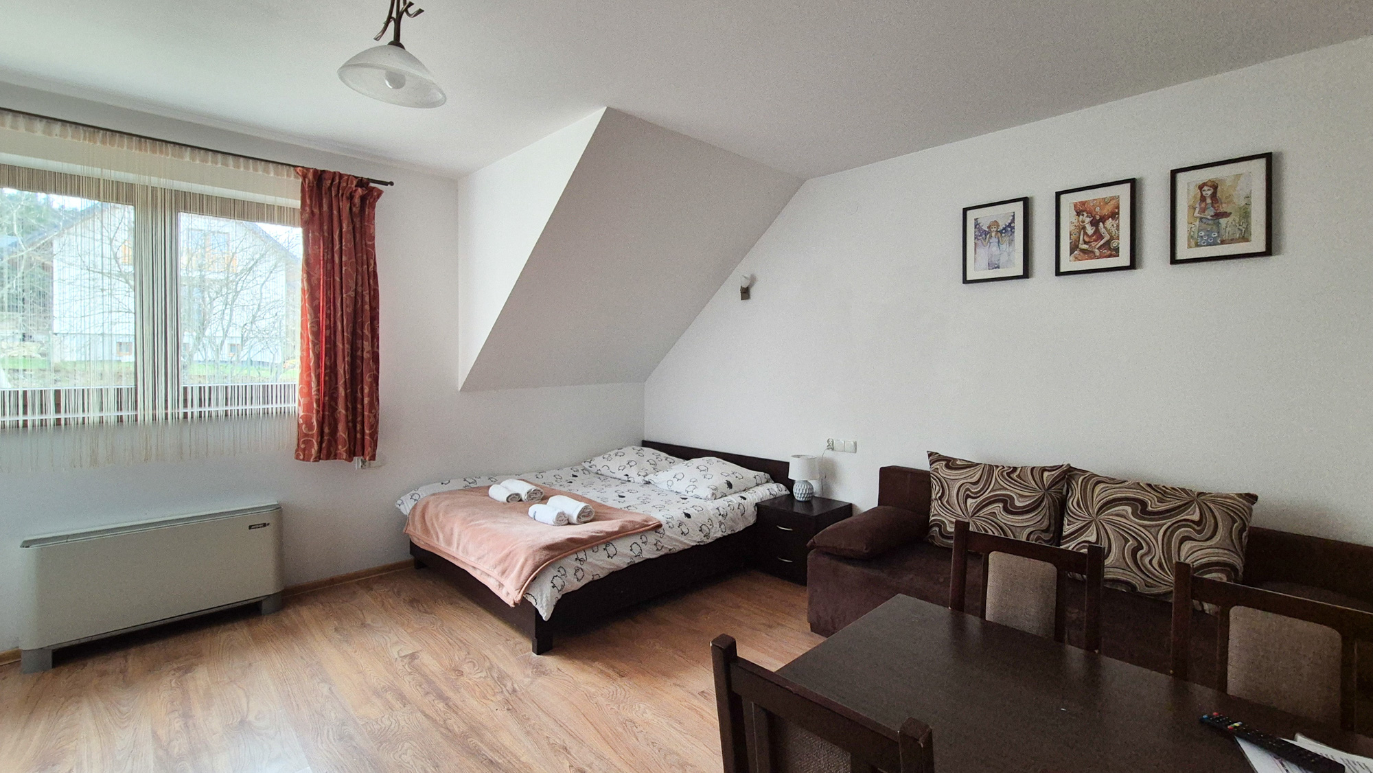 Przestronny apartament typu studio z dwiema wygodnymi sofami. Wnętrze jest jasne, z akcentami z surowego drewna na ścianach, nawiązującymi do górskiego stylu. Posiada aneks kuchenny i duże okno, które wpuszcza mnóstwo naturalnego światła.